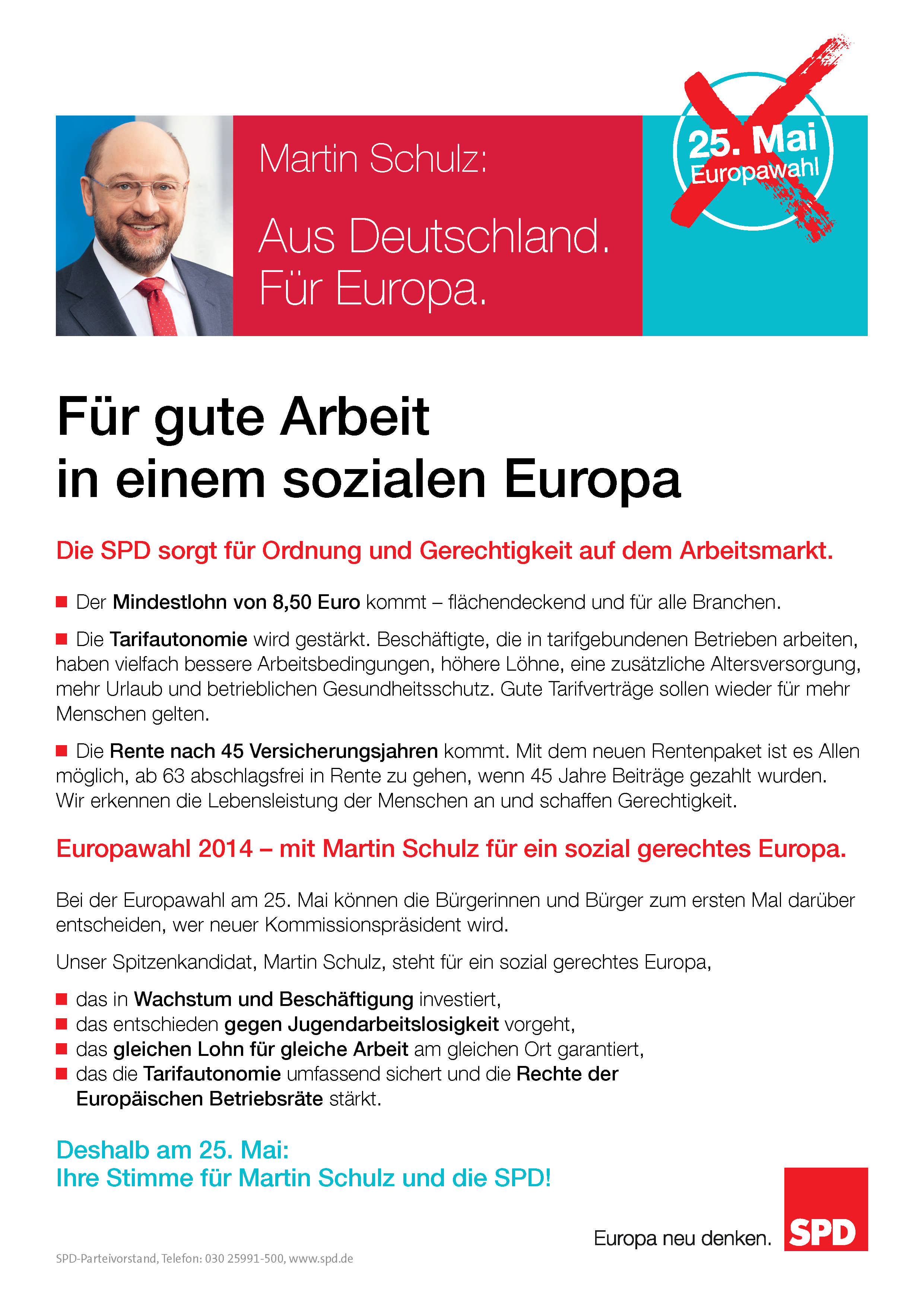 Doch wir Sozialdemokraten kämpfen nicht nur für ein soziales Deutschland, sondern auch für gute Arbeit in einem sozialen Europa mit Martin Schulz an der Spitze der Europäischen Kommission. Erstmalig entscheiden die Bürgerinnen und Bürger Europas darüber wer neuer Kommissionspräsident wird. Es geht bei dieser Europawahl um eine Richtungsentscheidung für diesen Kontinent. Die Fragen sind dabei die Folgenden: