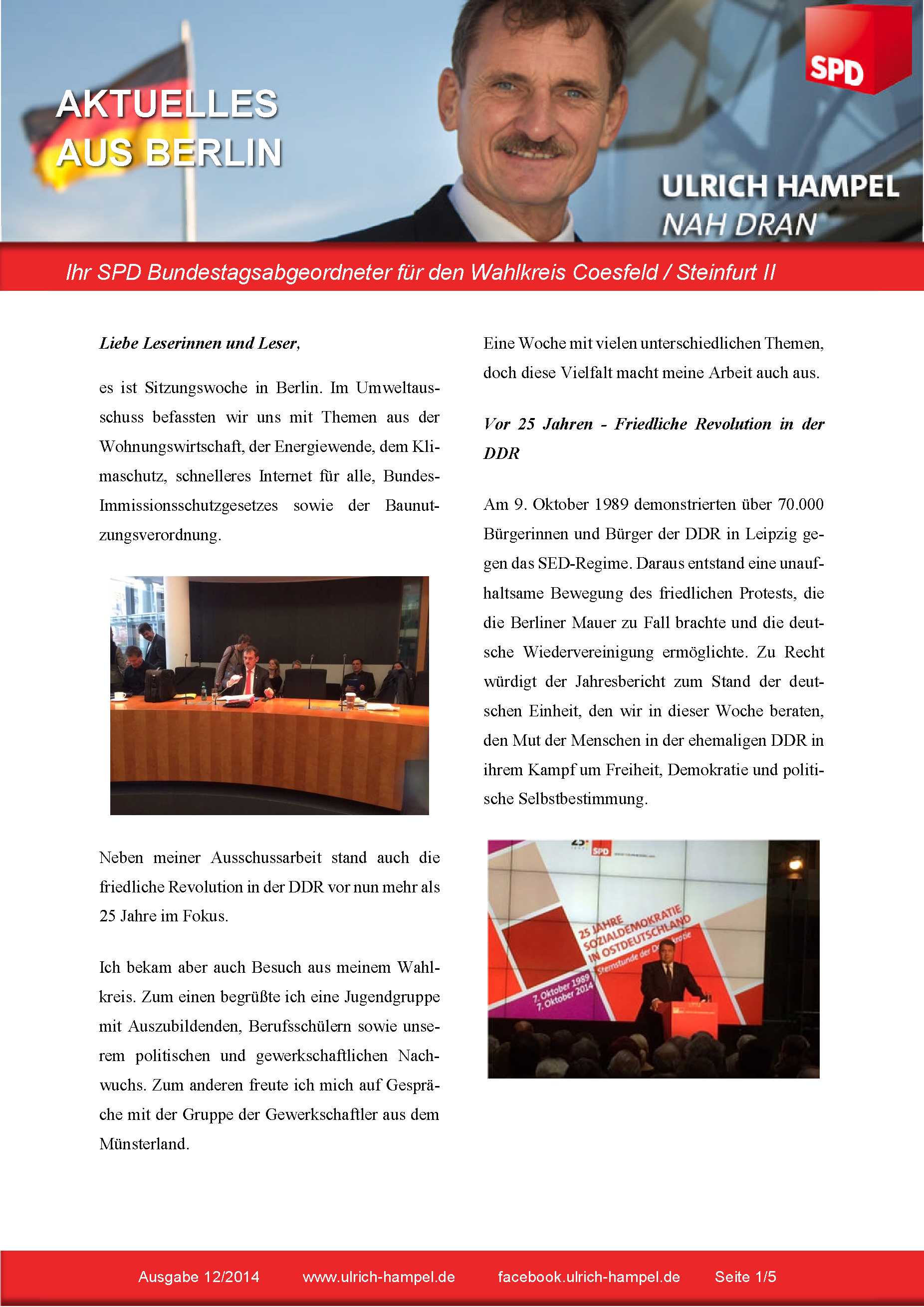 Es ist Sitzungswoche in Berlin. Und wie Sie es von mir gewohnt sind, erscheint Freitags – amUH_Newsletter 12-2014_1 Ende meiner Berliner Woche – der aktuelle Newsletter mit den Themen, die mich besonders beschäftigt haben, mit inhaltsvollen Treffen und Begegnungen, die ich schätze. In dieser Woche erstrecken sich die Themen über die friedliche Revolution in der DDR vor 25 Jahren, die Situation der Flüchtlinge (in Deutschland), Gute Arbeit Weltweit und schnelles Internet für alle. Darüber hinaus habe ich mich sehr über den Besuch meiner zwei Besuchergruppen gefreut. Auch dieses Mal hat sich mein Team und ich es uns nicht nehmen lassen die Gruppen am Bahnhof zu begrüßen.