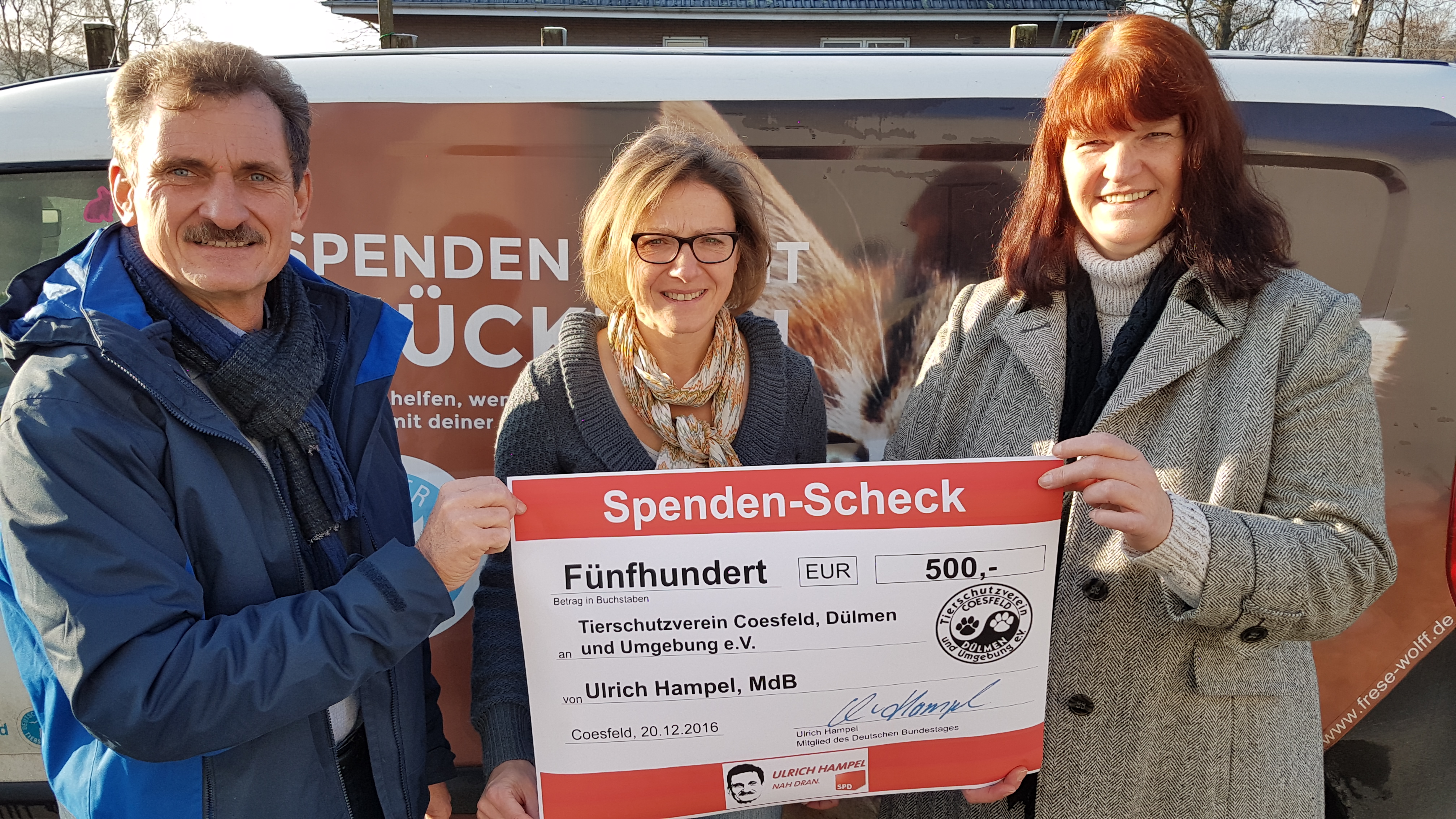 Am Dienstag, den 20. Dezember 2016 besuchte der SPD-Bundestagsabgeordnete für den Wahlkreis Coesfeld – Steinfurt II Ulrich Hampel die Tierschützerinnen des Tierschutzverein Coesfeld, Dülmen und Umgebung e.V. im Tierheim in Lette. Neben dem persönlichen Dankeschön für die wichtige Arbeit, die dort vor Ort geleistet wird, hatte Ulrich Hampel neben Sachspenden auch eine finanzielle Unterstützung von 500 Euro dabei. Bereits zum dritten Mal unterstützte der Bundespolitiker den Tierschutz damit finanziell. „Der Tierschutzverein macht eine tolle Arbeit und alle sind dort mit dem Herz dabei. Daher war es mir ein Herzensanliegen kurz vor Weihnachten nochmal in verschiedenster Weise Danke zu sagen.“, so Ulrich Hampel. Kurz nach dem Besuch aus Berlin schreibt der Tierschutzverein schreibt auf seiner Facebook-Seite dazu: „Ulrich Hampel hat uns heute – und wir müssen erfreulicherweise „schon wieder“ sagen – eine tolle Überraschung bereitet und so einiges an Geschenken vorbei gebracht. Wir möchten uns ganz, ganz herzlich bedanken!“.