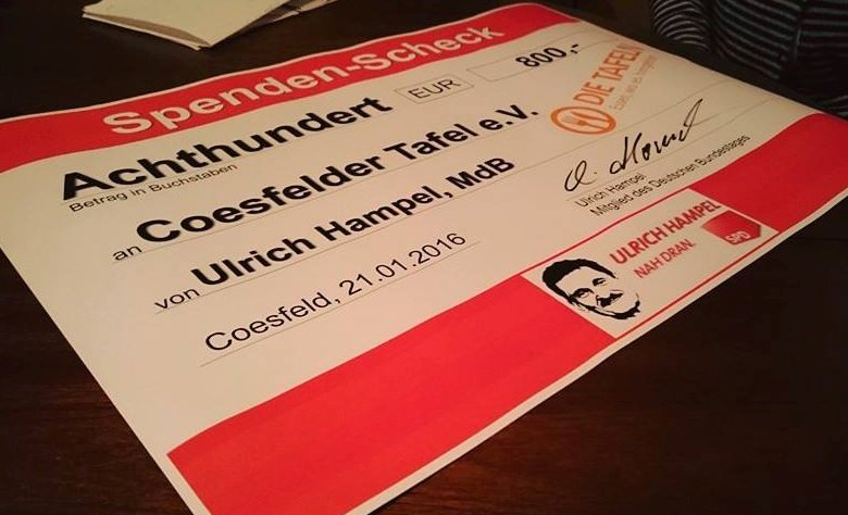 120 Helferinnen und Helfer gehören zum Team der Coesfelder Tafel e.V.. Viele davon arbeiten hier ehrenamtlich, einige Empfänger von sozialen Leistungen haben hier einen kleinen Ein-Euro-Job aber auch Freunde und eine Aufgabe gefunden. Die Vorsitzende, Hildegard Sonnenschein, ist stolz auf dass, was hier seit 10 Jahren geleistet wird. „In den letzten Jahre, sind es immer mehr Bedürftige geworden, die hier ihre Lebensmittel zu einem kleinen obligatorischen Beitrag einkaufen. Zuletzt ist die Gruppe der Flüchtlinge aus Coesfeld und dem Umland dazugekommen.“ so Hildegard Sonnenschein, die jede neue Herausforderung annimmt und versucht, diese bestmöglich zu lösen. Umso mehr freut sie sich über die Spende in Höhe von 800 €, die der SPD-Bundestagsabgeordnete Ulrich Hampel an die Tafel übergibt.